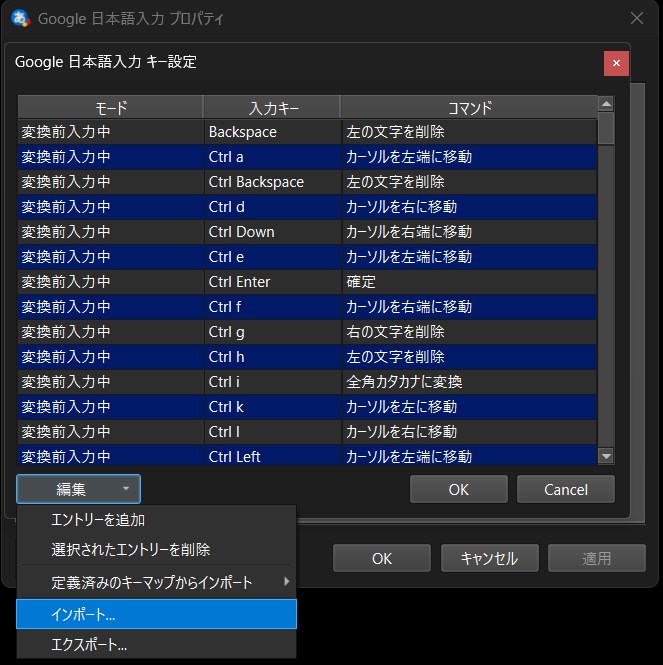 MS-IMEは非常に簡単に無変換キー変換キーを設定できたが、Google日本語入力は少々面倒。正攻法はIME左手側の文字状態の部分を右クリックしてプロパティーからキー設定編集を1つずつ行わなければならないが、自分のキーマップ機能をインポート出来る機能があるので是非とも使ってほしい。