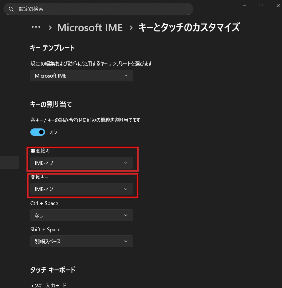 タスクバーのIME左手側の文字状態の部分を右クリックして設定へ。次にキータッチのカスタマイズへ行き、キーの割り当て項目での”無変換キー”をIME-オフへ。”変換キー”をIME-オンへ。これをするだけ。これで実質Macの様な使い心地へ誘える。